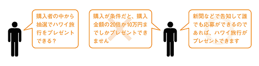 それぞれ、懸賞の内容や取引金額によって、提供可能な景品の最高額や総額に上限があるので、懸賞キャンペーンを実施する際にはその内容が規制内に収まっているかどうかの確認が必要です。