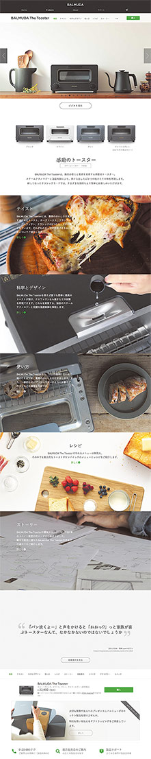 「BALMUDA The Toaster」図3では、印象的なヒーローイメージから商品の概要、機能や製品特徴の説明と階層下へのナビゲーション、使用者のレビュー、そして購入ボタンや展示販売店を探すボタンなどを含めたコールトゥアクション…と、スクロールの中に閲覧者に与えたい情報と行動のための要素が詰め込まれています。ユーザーの情報理解とそれに伴う行動が、スクロールに連動しているのです。