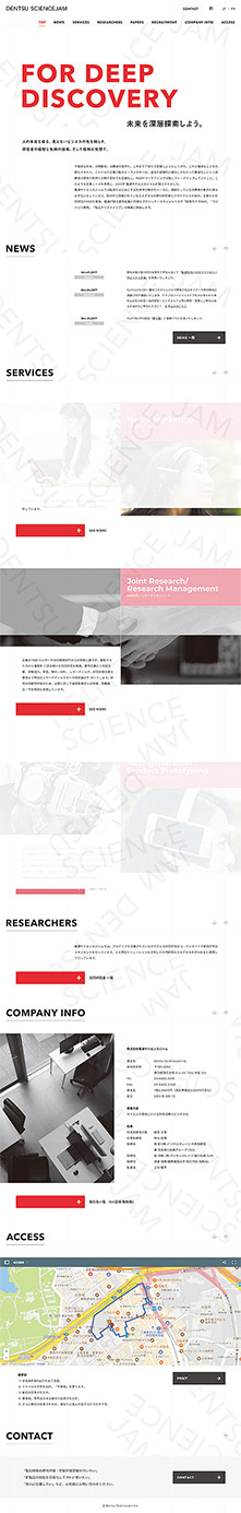 「電通サイエンスジャム」図5は、冒頭から大きな見出しで注目を集め、メッセージに集中させています。ナビゲーションや他の情報に画面の横幅を取られることがない分、大胆なレイアウトが可能になっています。シングルカラムレイアウトはそのまま要素を置くだけでは単調な見た目になってしまうため、要素をグリッド毎にずらすことでリズムを作っています。