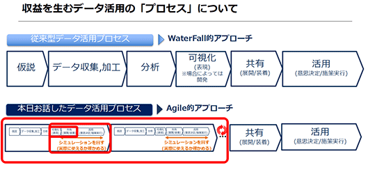 何度もシミュレーションを繰り返すこの方法は、手間がかかって効率が悪いと感じるかもしれないが、「営業社員の数を増やす、新しくサービスを開発するなど、売り上げを伸ばす方法は他にもあるが、データ活用にアジャイル型で取り組むのは、事業的にもROIのいいプロセス」(板谷越氏)だと言える。