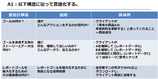 そこで、どのように話していけばゴールにたどり着くかというシナリオを先に作り、そのストーリーに合わせて必要なデータをレポートにするという考え方に変更した。