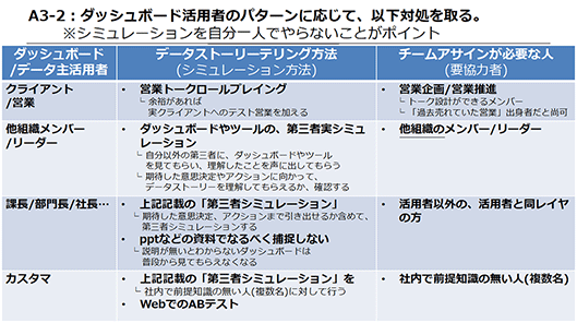 One Team、すなわちチーム一丸となってデータストーリーテリングを磨き込むべきだ。営業など事業の主体となる部門と、データ活用部門をチームとして組んだうえで、データ部門のメンバーをトップにすると動きやすい。ダッシュボード活用者のパターンによって、シミュレーションを誰にやってもらうかは、図を参考にしてほしい。