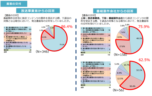 まず「コンテンツ製作の委託に際して、下請法の対象となる取引において、発注書面等の交付をしているか?」と聞くと、放送事業者側は「常に発注書を交付していた」73.1%、「おおむね発注書を交付していた」13.3%で、合計8割超が発注書を交付しているとした一方、放送事業者・番組製作会社側の「常に発注書を受けていた」「おおむね発注書を受けていた」という回答は、放送事業者で合計75.9%、番組製作会社で合計62.5%まで低下していた。中間におけるずさんな対応、あるいは発注側と受注側の意識差が浮き彫りになった形だ。