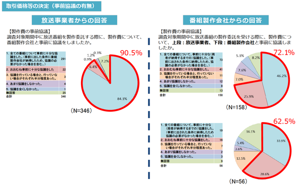 この調査では主に、「書面の交付」「取引価格等の決定(事前協議の有無)」「著作権の帰属(著作権の譲渡等の有無)」「取引内容の変更およびやり直し」の実態について、放送事業者・番組製作会社それぞれに質問した。