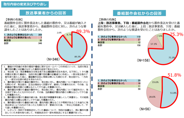 さらに「取引内容の変更およびやり直し」について聞くと、「番組の予告編の本数増加やホームページの作成といった、当初の発注書になかった業務を追加発注された」「一方的に、内容の一部または全部の修正を求められた」「内容確認を行ったにもかかわらず、継続して作業を行わせ、その後やり直しを要請された」「レギュラー契約で年間放送してい番組について、製作委託していた本数が取り消された(再放送にされた)」といった声があがった。こうした内容について、放送事業者側は「なかった」89.3%としているが、番組制作会社側は「なかった」は51.8%に留まるなど、認識のギャップが目立つ調査結果となっている。