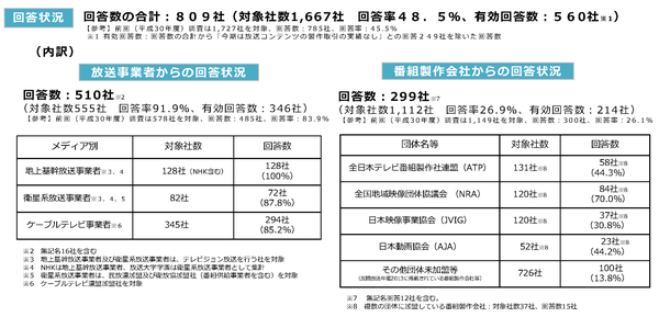 • 【有効回答数】放送事業者346社(対象社数555社のうち510社が回答)、番組製作会社214社(対象者数1,112社のうち299社が回答)
